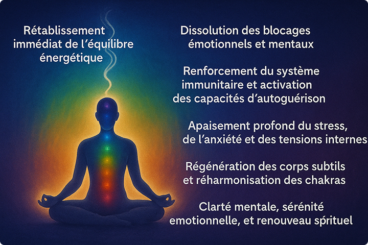 - Régénération énergétique : nettoyage des mémoires anciennes, réactivation des centres d’énergie, amélioration du bien-être global.